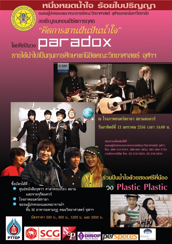 ชมรมผู้ปกครองและคณาจารย์ คณะวิทยาศาสตร์ จุฬาลงกรณ์มหาวิทยาลัย จัดคอนเสิร์ตการกุศล "คีตการสานฝันปันน้ำใจ" ภายใต้แนวคิด หนึ่งหยดน้ำใจ ร้อยใบปริญญา โดยเป็นการแสดงคอนเสิร์ตจากวง Paradox (พาราด็อกซ์) เพื่อจัดหาทุนในการสนับสนุน เป็นทุนการศึกษาให้กับนิสิต คณะวิทยาศาสตร์ จุฬาฯ