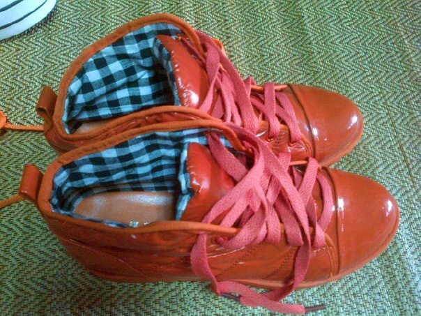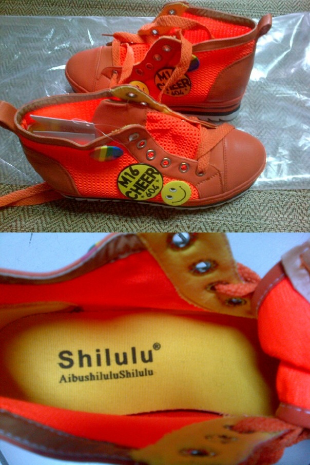 คู่สุดท้าย สีส้มจ๊าบมาก สีสดสุด ๆ มีติดเข็มกลัดรอบ ๆ ด้วย ส้นสุงประมาณ 1.5 นิ้วเเหมือนคุ่ม่วง