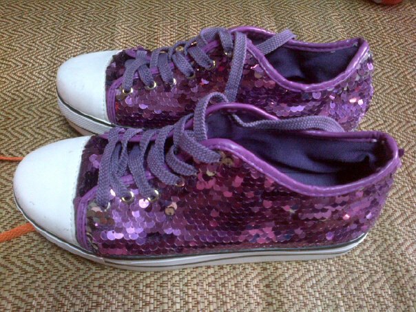 คู่ที่สอง สีม่วงวิ๊ง ๆ ส้นรองเท้าสูงประมาณ 1.5 นิ้ว คู่นี้ตอนแรกเพื่อนอยากได้ไว้ แต่ตัวแสบที่บ้านไม่ยอม