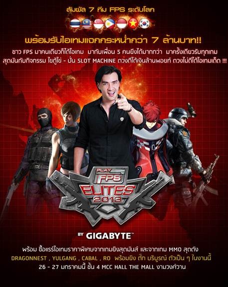 ดาราพิธีกรชื่อดัง ตั๊ก บริบูรณ์ จันทร์เรือง เตรียมความสนุกสนาน และกิจกรรมสุดมันส์ พร้อมชวนเหล่าเกมเมอร์ร่วมงาน PlayFPS Elites2013 by GIGABYTE สุดยอดงานแข่งเกมยิงครั้งยิ่งใหญ่ ที่เป็นการร่วมมือกันระหว่างบริษัท Asiasoft 6 ประเทศ (ไทย, มาเลเซีย, สิงค์โปร์, ฟิลิปปินส์, อินโดนีเซีย, เวียดนาม) จัดการแข่งขัน E-Sport ครั้งใหญ่ระดับ South East Asia ซึ่งประเทศไทยได้รับเกียรติให้เป็นเจ้าภาพจัดการแข่งขันครั้งแรกกับการระเบิดศึกนัดสุดท้ายหาสุดยอดแชมป์จาก 6 ประเทศประกอบด้วย ไทย,มาเลเซีย, สิงค์โปร์, ฟิลิปปินส์, อินโดนีเซีย, เวียดนาม ในรายการ A.V.A SOUTHEAST ASIA CHAMPIONSHIP 2013 และศึกใหญ่ครั้งสุดท้ายของรายการ SUDDEN ATTACK SEASON 2 SOUTHEAST ASIA CHAMPIONSHIP 2013 ที่นอกจากจะประกอบด้วยแชมป์จาก 6 ประเทศแล้ว ยังเพิ่มดีกรีความมันส์ด้วยทีมแชมป์รับเชิญจากเกาหลี ชิงเงินรางวัลรวมกว่า 12,000 ดอลลาห์ ตบท้ายด้วยการแข่งขันสำหรับคอ FPS รุ่นเก๋าที่ยังมันส์ไม่ยั้งกับ Counter Strike ONLINE Mini Elites Cup และ S4League Ranger Mini Elites Cup ชิงรางวัลมูลค่ากว่า 20,000 บาท งานนี้พร้อมระเบิดความมันส์ให้ชาวไทยร่วมใจกันเชียร์ทีมชาติไทย วันที่ 26-27 มกราคม 2556 ที่ชั้น 4 MCC Hall เดอะมอลล์ งามวงศ์วาน