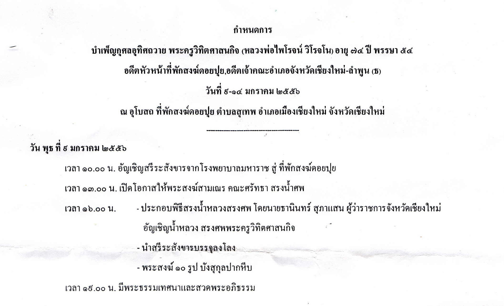 กำหนดการบำเพ็ญกุศลอุทิศถวายหลวงพ่อไพโรจน์ วิโรจน์โน วัดดอยปุย