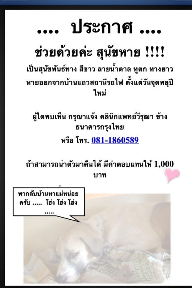 สวัสดีค่ะ พอดี เมื่อวันที่31ธันวาคม2566 น้องหมาได้ตกใจเสียงพลุ (ประมาณ2ทุ่ม) แล้ววิ่งหนีเตลิดไป หาเท่าไหร่ก็ไม่เจอเลยค่ะ เป็นห่วงน้องมากๆ ไปตามหาก็แล้ว ถามคนแถวบ้านก็ไม่มีใครเห็นเลย พอจะมีวิธีไหน ที่ช