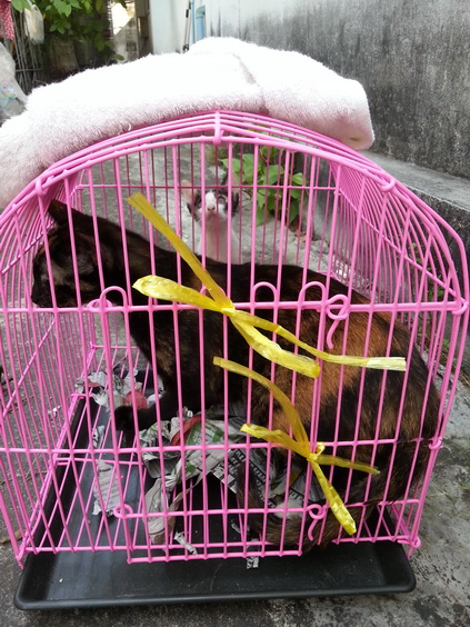 วันนี้จขกท ต้องไปรับแมวตัวผู้ผ่าตัดไส้เลื่อน+ทำหมันที่คลินิคกลับ ก็เลยคิดว่าจับแม่แมวในรูไปทำหมันด้วยเลยดีกว่าจะได้ไม่เสียเที่ยว ลูกแมวก็โตแล้วกินอาหารเม็ดได้แล้ว กลัวแม่แมวจะท้องอีก คราวนี้ไม่มีตะกร้าเลยใช้กรงล่อ เอาชาร์กูเม่ต์ใส่เข้าไปให้แม่แมวเดินเข้าไปกินก็ได้ผลในเวลารวดเร็ว