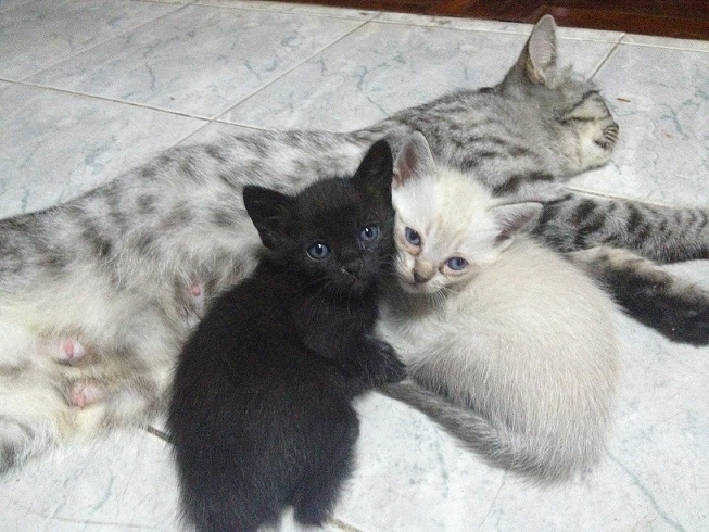 ภาพไม่ชัดเท่าไหร่ เพราะถ่ายจากมือถือ แล้วหลานๆ ไม่อยู่นิ่งซักที 555 แล้วก็ทั้งสี่ตัวเป็นพี่น้องคลอกเดียวกันครับ (อีทีตัวที่สองมันหลงมาได้งายยยยย)
