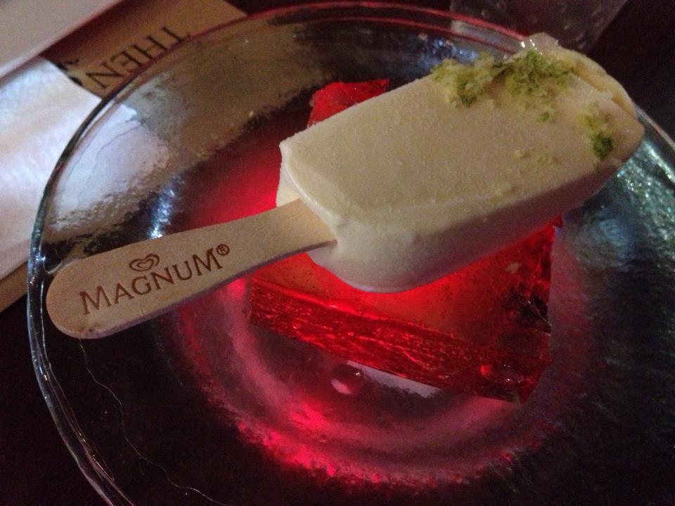 จานแรก แม๊กนั่มกับไวน์ อร่อยค่ะ กลิ่นไวน์ดีเลย มีผลไม้อยู่ในตัวเยลลี่ แต่เราไม่รู้ว่าคืออะไร ฮ่าๆ(เรียนครัวภาษาอะไรฟร่ะ)
