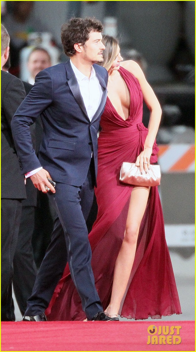 Miranda Kerr และ Orlando Bloom โพสท่าขณะมายังงานปาร์ตี้ the Warner Bros และ InStyle Golden Globe Awards จัดที่ the Oasis Courtyard ที่โรงแรม Beverly Hilton เมื่อวันอาทิตย์(January 13) ที่ Beverly Hills, Calif