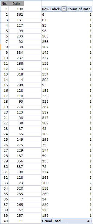 แล้วใช้ pivot table มา count ว่ามีวันเกิดซ้ำกันบ้างรึเปล่า จากการทดลองสุ่มเกือบยี่สิบครั้ง เจอกรณีที่วันเกิดไม่ซ้ำกันเลยแค่ครั้งเดียว