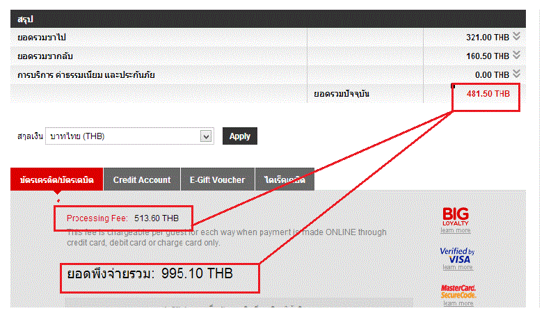ในกรณีเราใช้บัตรเครดิตจ่ายค่าตั๋ว จำนวนที่เราจ่ายราคาใหนครับตามรูปครับ 513 หรือ 995 ครับ