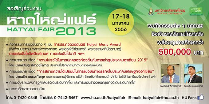 งานหาดใหญ่แฟร์ 2013 (Hatyai Fair 2013) มหกรรมงานวิชาการสำหรับนักเรียนนักศึกษาในภาคใต้ ได้มาร่วมทดสอบความสามารถทางวิชาการ ชิงโล่รางวัลและทุนการศึกษากว่า 500,000 บาท พร้อมกิจกรรมด้านวิชาการอื่น ๆ อีกมากมาย