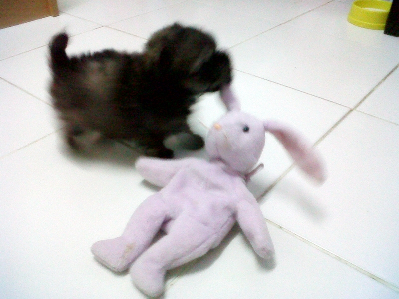 เพื่อให้ตังค์มานอนข้างๆ ตอนแรกเสียงก็เงียบไป แต่สักพักก็เริ่มเล่นอีก ตังค์มากระโดดลงจากเตียง (ลงทางข้างเตียงซึ่งมีเบาะนอนของตังค์มาวางอยู่) แล้วก็วิ่งมาที่ปลายเตียงร้องให้ จขกท. อุ้มขึ้นเตียงอีก ทำแบบนี้วนไปวนมาหลายรอบมาก .. สรุป ..กว่า จขกท. จะได้นอนก็เกือบ 6 โมงเช้า