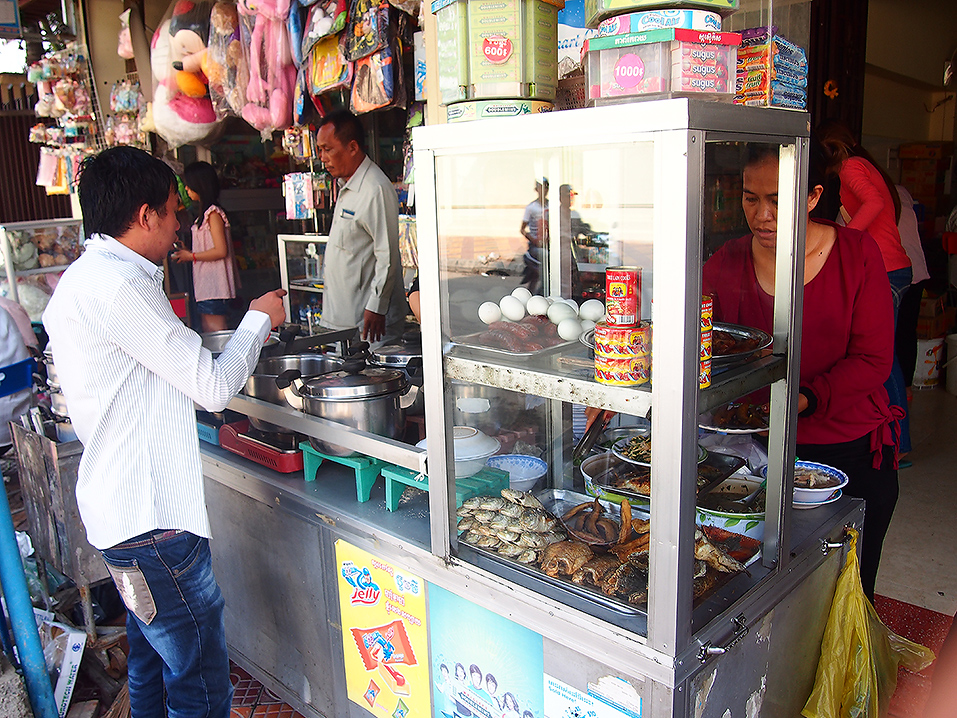 บรรยากาศร้านอาหารใน พนมเปญ ปลาจะทอดไว้แล้วเป็นตัวๆ ชอบแบบใหนก็เลือกได้เลยครับ