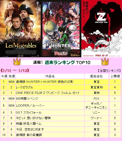 Japan Box Office 12-13 มค. HxH Movie เปิดตัวอันดับที่1, วันพีชZโกย6พันล้าน