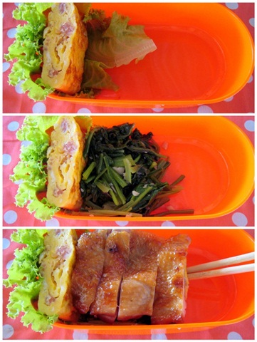 กับข้าววันนี้มี 3 อย่างด้วยกัน มีผัดกวางตุ้งน้ำมันหอย ไข่เจียวแหนมที่ทำเหมือนไข่ม้วน และไก่เทริยากิ