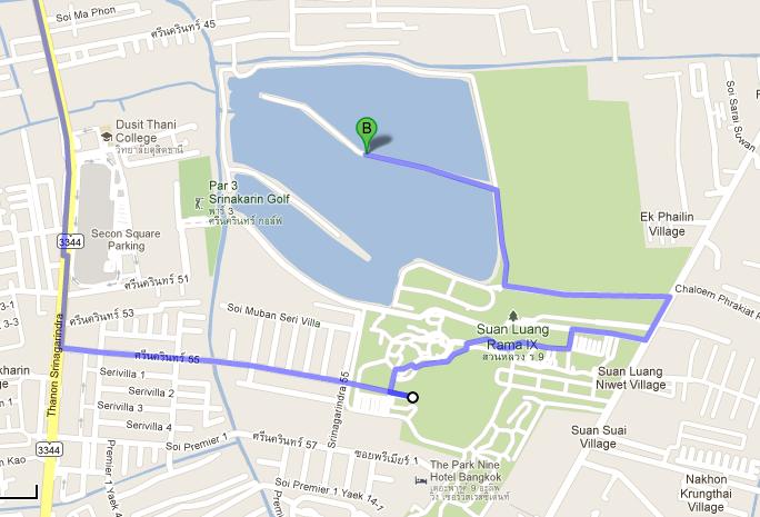 ปั่นจากหอพักแถวๆตลาดเอี่ยมสมบัติ ปั่นเส้นศรีนครินทร์ ผ่านปากทางห้างพาราไดซ์ เข้าไปสวนหลวงร.9ก่อน แล้วตัดไปทางถนนหลังสวนหลวงร.9 เข้าบึงหนองบอนอีกที (อยู่ติดๆกันแต่ทะลุหากันไม่ได้ มีรั้วกั้นไว้ชัดเจน) ระยะทางไปประมาณ7กม.