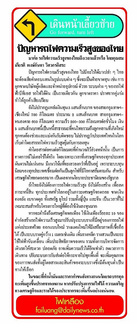 คอลัมน์ เดินหน้าเลี้ยวซ้าย: ปัญหารถไฟความเร็วสูงของไทย