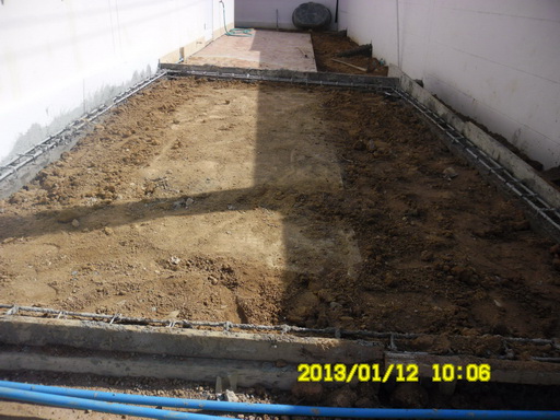 2 งานห้องเก็บของ ก็ไม่มีเสาเข็ม แต่ขุดดินลึก 1 ฟุตเพื่อทำ ฟุตติ้ง แล้วเทปูนดังรูป พื้นห้องก็เทปูนชั้นหนึ่ง แล้วเอาดินถม แล้วก็มาเทปูนอีกเพื่อปูกระเบื้อง