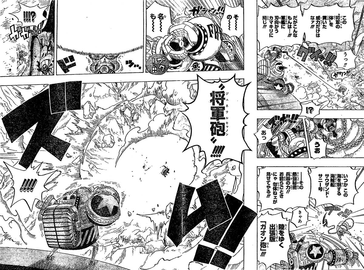 แต่กระนั้นแฟรงกี้บอกเลยว่าแบบนี้ก็เหมือนตั๊กแตนมาสู้กับเรือรบ ทันทีนั้นแฟรงกี้จับพวกบัฟฟาโล่เหวี่ยงโยนขึ้นไปบนอากาศพร้อมทั้งบอกเลยว่าถึงจะน่าเสียดายอยู่ที่เอามาใช้กับพวกบัฟฟาโล่แต่ก็จะให้ดูถึงพลังของอาวุธลับสุดยอดเช่นเดียวกับของเรือซันนี่ ปืนกาออนที่นำมาใช้บนพื้นดิน แล้วแฟรงกี้ก็ให้หุ่นตั้งท่ายิงปืนและยิงออกมาเป็น "เจเนรัลแคนนอน" ใส่พวกบัฟฟาโล่ พวกบัฟฟาโล่ที่โดนเล่นงานจนปลิวถึงกับคิดเลยว่าบ้าบออะไรแบบนี้ แล้วทำไมแฟรงกี้ถึงขัดขวางพวกเขาไม่ให้เอาตัวซีซ่าร์กลับไปด้วย