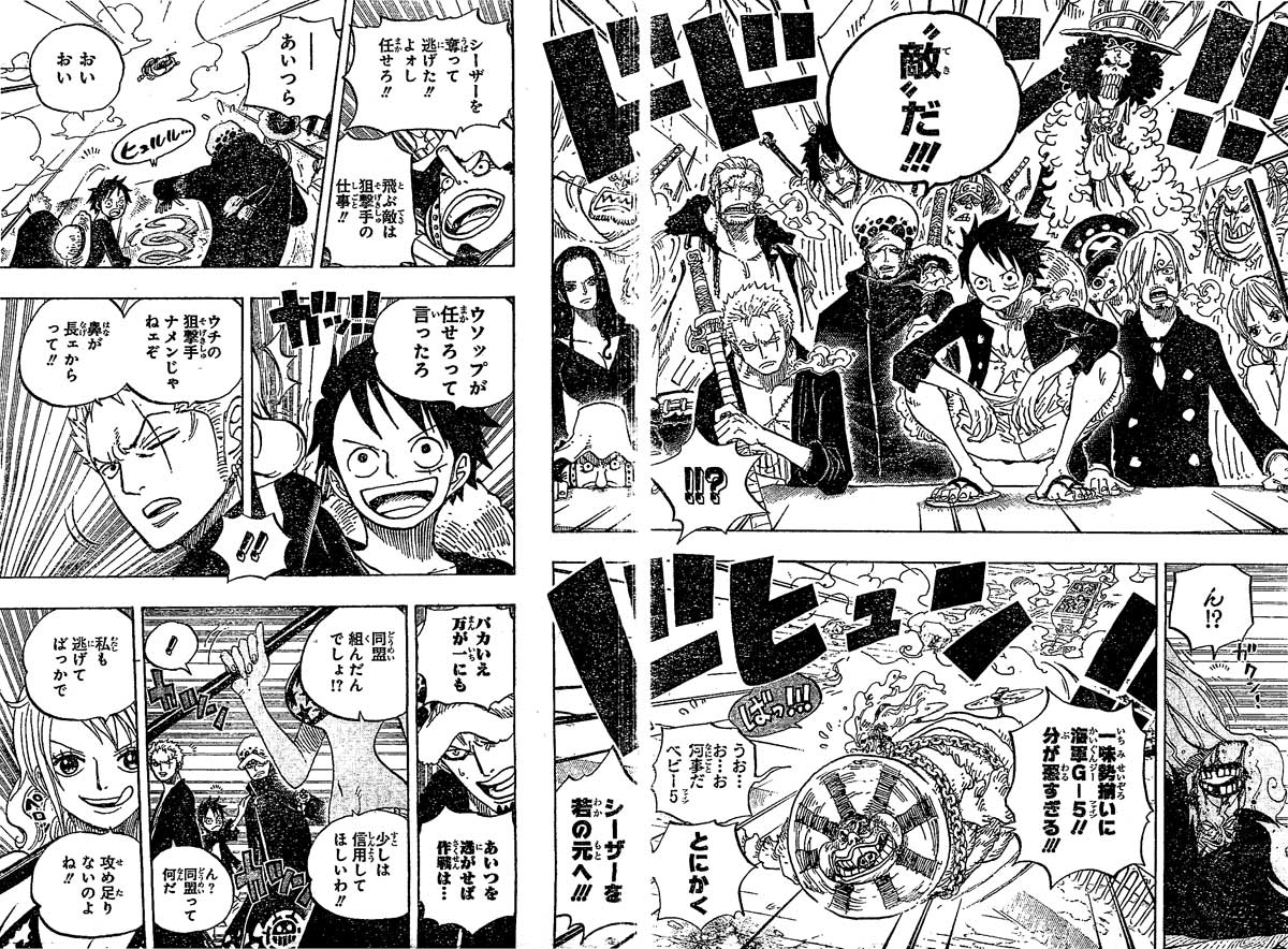 งานนี้พอพวกบัฟฟาโล่เจอทั้งพวกลูฟี่และพวกทหารเรือโผล่ก็คิดเลยว่ายังไงก็ไม่มีทางสู้ได้เลยรีบหนีทันทีโดยไม่สนซีซ่าร์แล้ว อุซปบอกพวกบัฟฟาโล่คิดจะเอาตัวซีซ่าร์กลับอุซปเลยขอจัดการในฐานะพลซุ่มยิง พอดีที่ลอว์เองก็คิดจะลงมือแต่พวกลูฟี่บอกให้อุซปจัดการตามที่อุซปบอก ลอว์บอกอย่าบ้ากันหน่อยเลยขืนให้พวกนั้นหนีไปได้แผนก็จะ... แต่นามิบอกในเมื่อเป็นพันธมิตรกันก็ไว้ใจกันหน่อยสิและบอกเธอเองก็จะสู้ด้วยหลังจากที่เอาแต่วิ่งมาอย่างเดียวตลอด และเหตุผลที่อุซปกับนามิกล้าพูดขนาดนี้ก็เพราะศัตรูที่อยู่ไกลและไม่คิดสู้ทั้งยังบาดเจ็บและกำลังหนีนั้นเองจนโซโลบอกเลยให้รีบๆลงมือสักที