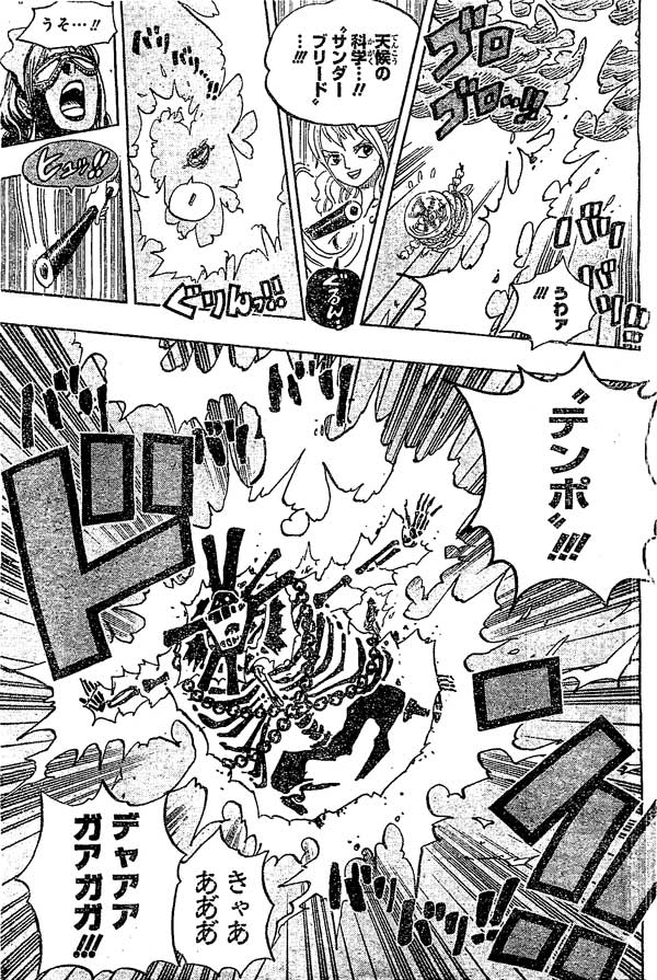 ตอนนั้นเองมีบางอย่างลอยขึ้นมาเหนือพวกบัฟฟาโล่นั้นคือฝีมือของนามิที่ใช้ "ไข่อากาศ" และสั่งให้ไข่ปล่อยเมฆสายฟ้าขนาดใหญ่ทำให้มีเมฆสายฟ้าลอยอยู่เหนือพวกบัฟฟาโล่ เบบี้5เห็นเมฆสายฟ้าก็รีบบอกให้บัฟฟาโล่รีบบินออกแต่ก็ช้าไปแล้ว เพียงนามิแค่วาดกระบอกของเธอก็เกิดสายฟ้าฟาดลงมา แม้บัฟฟาโล่จะหลบได้แต่สายฟ้าของนามินี้นามิสามารถควบคุมได้อย่างอิสระทำให้สายฟ้าที่ผ่าลงมาแล้วพลาดม้วนตามไปหาบัฟฟาโล่อีกครั้งผ่าตัวบัฟฟาโล่เข้าเต็มๆ