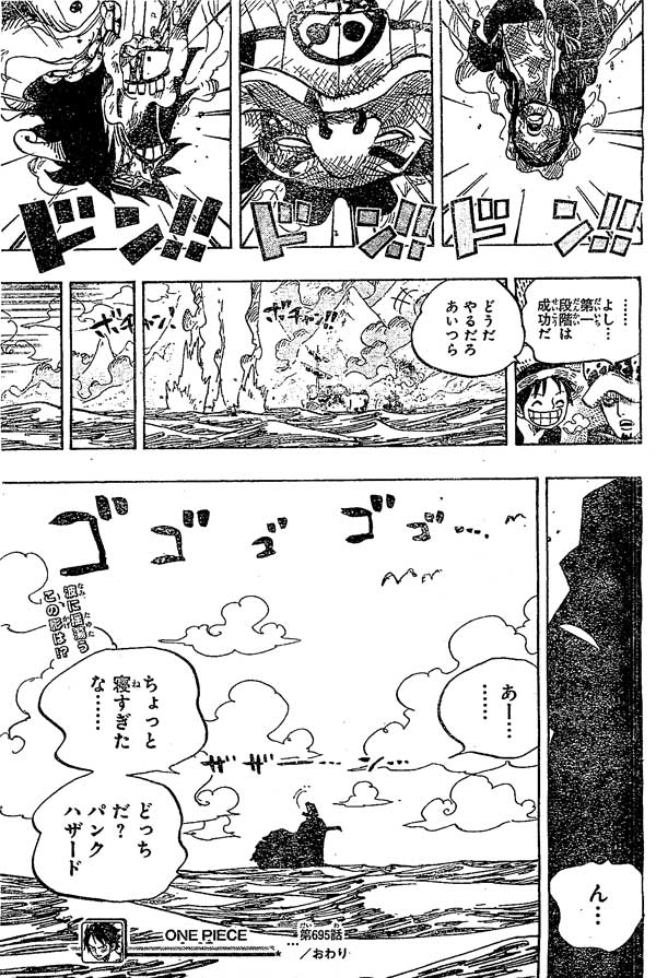 ต่อจากตอนที่แล้ว ด้านแฟรงกี้ที่ยังคงสู้กับพวกบัฟฟาโล่ ทางบัฟฟาโล่เองก็กำลังหงุดหงิดที่ทำอะไรแฟรงกี้ไม่ได้ถึงงั้นบัฟฟาโล่ก็ลุยต่อแม้แฟรงกี้จะบอกว่าถึงจะพยายามแค่ไหนก็ซุปเปอร์เปล่าประโยชน์ คราวนี้บัฟฟาโล่ใช้การหมุนตัวแนวขวางและให้เบบี้5แปลงขาเป็นเคียวจนเจาะทะลุแขนหุ่นของแฟรงกี้ได้สำเร็จจนแฟรงกี้ขอชมที่สามารถเจาะเกราะหุ่นของเขาได้