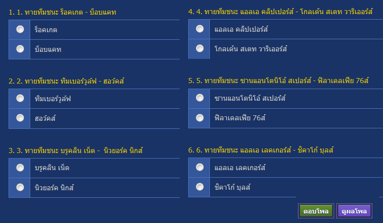 โพลทายผลบาสพรุ่งนี้ค่ะ มีเด็ดๆ ทั้งหมดเลย 6 คู่ ทายทีมชนะค่ะ ปิดโหวตก่อนเกมแรกแข่ง