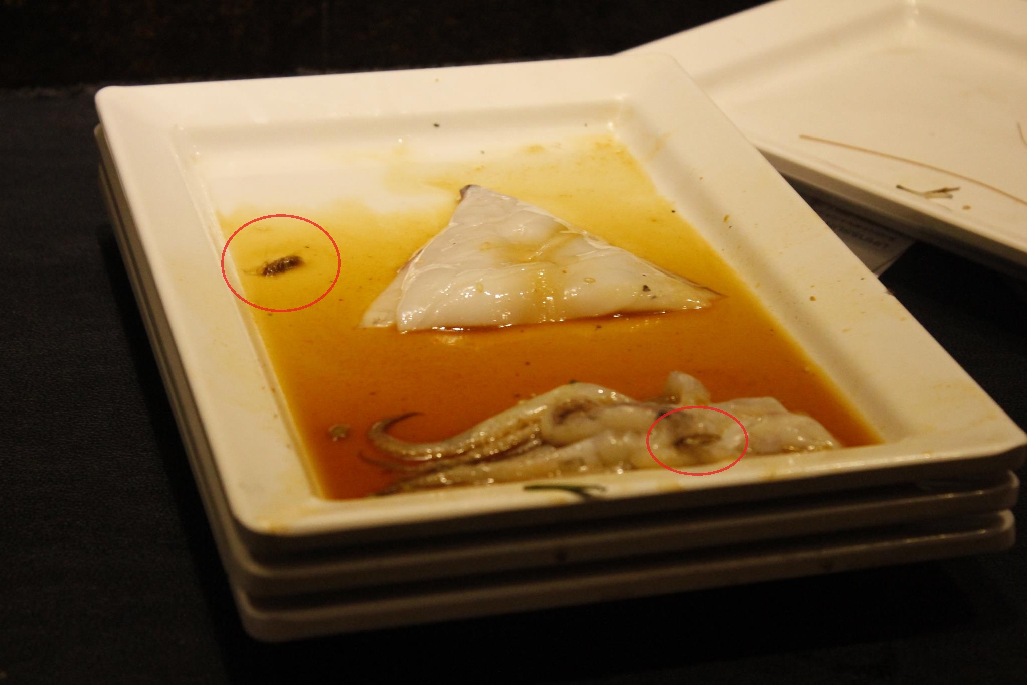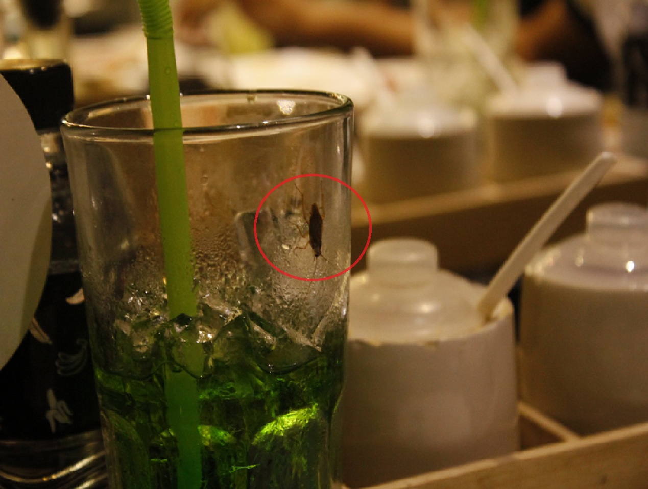 พอพวกผมกินไปได้ซักพักหนึ่ง ผมก็สังเกตเห็นสิ่งที่มีรูปร่างคล้ายแมลงสาบ เดินมาอยู่ข้างๆโต๊ะ ก็ไม่ได้รู้สึกอะไร ก็ปัดให้ลงไปจากโต๊ะ ยังไม่ได้เอะใจอะไรมากมาย ก็ยังคงตั้งหน้าตั้งตากินกันต่อไป หลังจากนั้นก็มีแมลงสาบ ไม่แน่ใจว่าตัวเดิมหรือเปล่า มาอยู่ข้างๆตรงโซฟาทีนั่ง ด้วยส่วนตัวแล้ว ไม่ได้กลัวแมลงสาบขนาดนั้น (แต่แค่อย่าใกล้กันเลยก็ดี) จึงได้ทำการหยิบกระดาษทิชชู่ปัดแมลงสาบตัวนั้นไป เพื่อนที่นั่งอยู่ด้วยก็เลยเห็นว่าผิดสังเกต ก็เลยถาม ผมก็ตอบไปตามตรงว่า เป็นแมลงสาบ หลังจากสิ้นเสียงเท่านั้นแหละครับ มีแมลงสาบตัวนึงค่อยๆคืบคลานเดินขึ้นไปบนแก้วน้ำของเพื่อนผมที่นั่งอยู่ฝั่งตรงข้าม อย่างไม่รู้ร้อนรู้หนาว พอทุกคนเห็นเช่นนั้น เพื่อนผมจึงขอเปลี่ยนแก้วกับพนักงานชายคนนึงในร้าน แต่ด้วยอะไรไม่ทราบเหมือนกัน เขาทำทีท่าเหมือนไม่เข้าใจ(หน้าตาส่วนใหญ่ของพนักงานในร้านออกค่อนข้างเป็นแขกๆ หน่อยครับตอนช่วงเวลาที่ผมไปรับประทานกัน) ก็สื่อสารกันไปซักพัก ด้วยความหวาดระแวง สายตาผมก็ดันไปเจอกับอะไรอีกบ้างสิ ที่อยู่ในจานปลาหมึก เพื่อนๆของหนูน้อยแมลงสาบ โผล่มาอีกสองตัว โดยที่มีคุณแมลงสาบตัวนึงกำลังหงายท้องว่ายท่ากันเชียงอยู่ ส่วนอีกตัวก็กำลังเดินอยู่บนตัวปลาหมึกอย่างสบายใจ ยังไม่พอแค่นั้นครับ เหมือนพวกผมไปทำอะไรให้คุณๆแมลงสาบไม่พอใจหรือเปล่า แห่กันมาเพียบเลยครับ ผมเริ่มเห็นแล้วว่าเหตุการณ์มันชักจะไม่ใช่แล้ว จึงทำการเรียกพนักงานว่า "โทษนะครับ ขอคุยกับผู้จัดการร้านหน่อยครับ" เพราะส่วนตัวแล้ว กับการจ่ายเงินมูลค่าเกือบ 500 บาทมารับประทานอาหารมื้อๆหนึ่ง เรื่องความสะอาดเป็นสิ่งที่ไม่ควรมองข้าม (ร้านอาหารทั่วไปก็เช่นเดียวกัน)