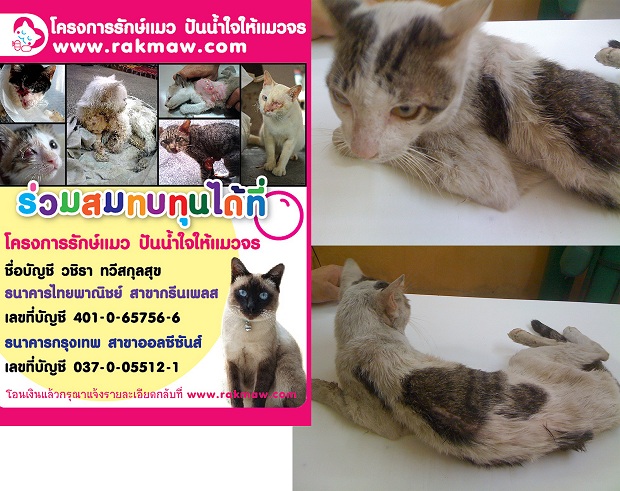 คาร์ลอสเริ่มไม่ค่อยกินอาหารตั้งแต่วันที่ 12 จนกระทั่งวันที่ 16 คาร์ลอสอาเจียนออกมามีพยาธิ 2 ตัว จึงพาไปพบคุณหมอ คุณหมอถ่ายพยาธิฉีดยากระตุ้นภูมิ และให้ยากลับมากินบ้าน จากนั้นเค้าก็อาเจียนออกมาอีกพร้อมกับพยาธิที่ตายแล้ว และก็มีเลือดเป็นจุดสีแดงๆออกมาด้วย ซึ่งคุณหมอบอกว่าเกิดจากการที่พยาธิเข้าไปชอนไชในปอด และคิดว่าคาร์ลอสน่าจะมีพยาธิอยู่เยอะมากด้วยค่ะ เพราะถ่ายออกมาก็มีพยาธิที่ตายแล้วออกมาอีก คาร์ลอสยังกินอะไรไม่ได้จึงพาไปให้น้ำเกลือจนกระทั้งเมื่อเช้าคาร์ลอสช็อกและหายใจแผ่วมาก แต่คุณหมอกู้กลับมาได้ ตอนนี้เริ่มหายใจเองบ้างแล้วแต่ยังต้องให้ออกซิเจนอยู่ค่ะ ขอกำลังใจให้คาร์ลอสด้วยนะคะ T/\T น้องอยู่ในภาวะวิกฤติจริงๆค่ะ รวมทั้งขอความเมตตาจากเพื่อนๆ เรื่องระดมทุนค่าใช้จ่ายของคาร์ลอสด้วยนะคะ สามารถบริจาคสมทบทุนค่ารักษาเจ้าคาร์ลอสได้ตามเลขที่บัญชีโครงการรักษ์แมว ด้านล่างนี้นะคะ หลังจากโอนเงินแล้ว แจ้งกลับมาที่เมลล์ rakmaw@gmail.com ค่ะ สำหรับคาร์ลอส เคสที่ 55/313