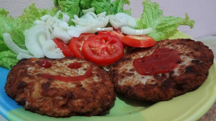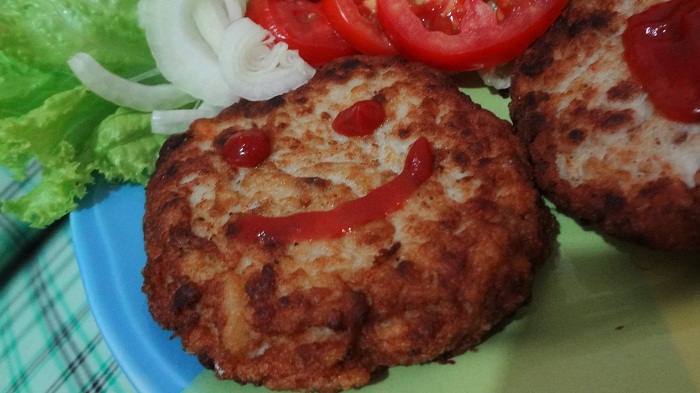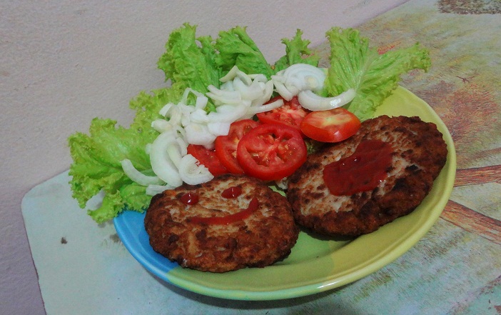 8. ทอดจนสุกเรียบร้อย เอาขึ้นสะเด็ดน้ำมัน กระดาษซับมันก็กระดาทิชชู่นี่แหละค่ะ แล้วก็ไปค้นผักในตู้เย็นออกมาล้าง จัดใส่จาน หั่นหอมหัวใหญ่ (หั่นไปร้องไห้ไป เรื่องมันเศร้า ) อย่าลืมหั่นมะเขือเทศนะคะ ผิวพรรณจะได้งามๆ