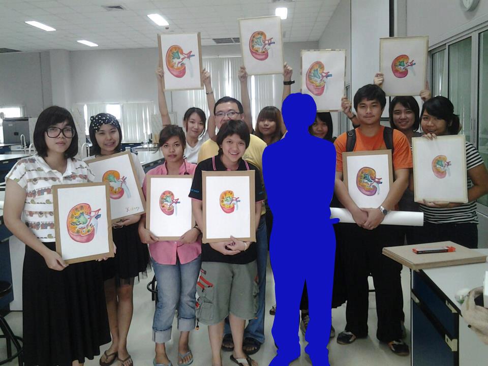 ให้กับน้อง ๆ นักศึกษา มหาวิทยาลัยรังสิต มหาวิทยาลัยแห่งการเรียนรู้อีกแห่งหนี่งที่มักมีกิจกรรมดีดีเสริมหลักสูตร ให้นักศึกษาได้ทำกัน มาครั้งนี้ได้มีโอกาสมาสอนการวาดภาพวิชาการทางการแพทย์ ให้น้องนักศึกษา ได้เห็นบรรยากาศการเรียนรู้ ความน่ารักสดใสและความตั้งใจในการทำงาน ตลอดจนความเป็นครูของท่านอาจารย์ท่านอาจารย์ที่ได้เชิญผมเป็นวิทยากร ถือเป็นอาจารย์วิชาชีพที่มีคุณภาพอีกท่านหนี่งครับ ได้เห็นความเป็นกันเองของเหล่าลูกศิษย์และอาจารย์ ที่ยกให้อาจารย์ท่านเป็นพ่ออีกคนหนี่ง ทำให้ผมอดคิดไม่ได้ว่า การเป็นครู หาใช่การสอนตามบทเรียน ตามหลักสูตร แต่อยู่ที่การสอนให้ลูกศิษย์ที่เปรียบเสมือนก้อนเพชรที่ผู้เป็นครูบาอาจารย์เจียระไน ทั้งทางด้านความรู้ และการเอาใจใส่ในแง่ของการดำเนินชีวิตให้เป็นบุคคลที่มีคุณภาพของสังคม ดีใจครับที่ได้มาเผยแพร่ศาสตร์การวาดภาพทางการแพทย์ที่นี่ น้อง ๆ น่ารักและมีความตั้งใจมาก ไม่น่าเชื่อว่าเป็นงานภาพวาดสีน้ำครั้งแรกในชีวิต และที่สำคัญวาดภาพทางการแพทย์ หวังว่าสิ่งที่ได้สอนไปจะนำไปประยุกต์ใช้ในการทำงานต่อไป