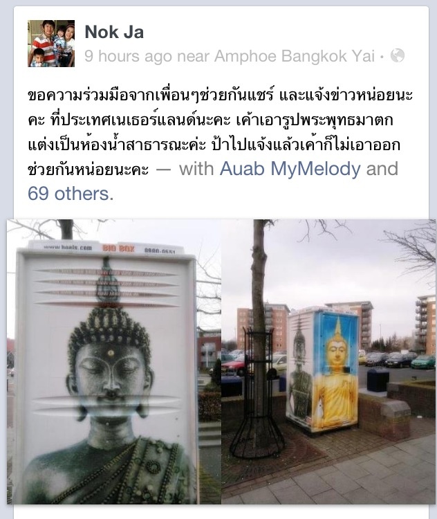 Nok Ja : ขอความร่วมมือจากเพื่อนๆช่วยกันแชร์ และแจ้งข่าวหน่อยนะคะ ที่ประเทศเนเธอร์แลนด์นะคะ เค้าเอารูปพระพุทธมาตกแต่งเป็นห้องน้ำสาธารณะค่ะ ป้าไปแจ้งแล้วเค้าก็ไม่เอาออก ช่วยกันหน่อยนะคะ