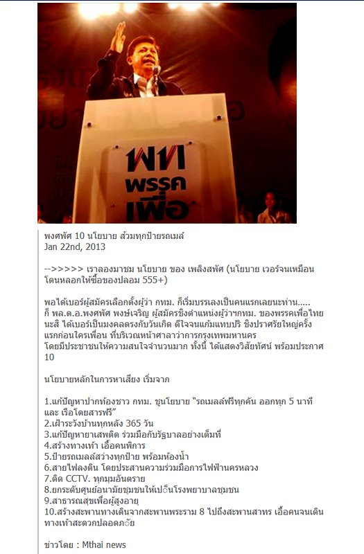 จากข่าว http://www.thairath.co.th/content/pol/321779 'พงศพัศ'บุกหาเสียงขรก.กทม. ขับรถเมล์โชว์สื่อ พล.ต.อ.พงศพัศ พงษ์เจริญ ผู้สมัครผู้ว่าฯกทม. หาเสียงข้าราชการกทม.ที่ศาลาว่าการฯ โชว์ไอเดียผุดตั้งสนง.เข