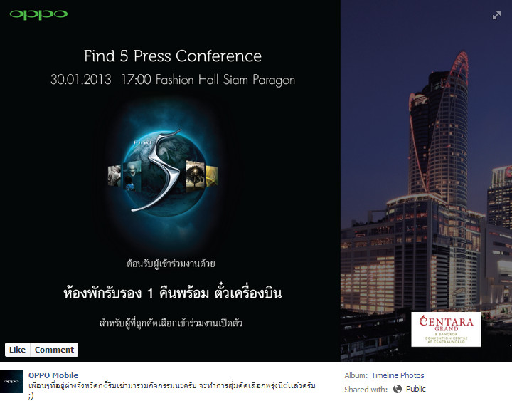 ในที่สุดความหวังที่ทุกคนรอคอยก็มาถึง เมื่อOPPO ได้ประกาศออกมาว่าจะมีงานเปิดตัว Find 5 ที่มีหน้าจอ 5 นิ้ว คมชัดระดับ Full HD 1080P ขึ้นในวันที่ 30 มกราคมนี้ ณ Fashion Hall Siam Paragon ผ่านทาง Facebook Fanpage และยังให้สิทธ์สุดพิเศษสำหรับสำหรับแฟนๆมีสิทธิ์เข้าร่วมในงานเปิดตัวในครั้งนี้ ยิ่งไปกว่านั้นสำหรับผู้โชคดีที่ได้รับรางวัล ทางออปโป้เค้ายังใจดีออกค่าที่พักสุดหรู ณ Centara Grand Hotel @ CentralWorld พร้อมตั๋วเดินทางให้แก่ผู้ที่มีสิทธิ์เข้าร่วมกิจกรรม งานนี้ ใครที่คิดว่าตัวเองเป็นแฟนพันธ์แท้ OPPO และอยากสัมผัสเครื่องจริงพร้อมร่วมลุ้นการประกาศราคาของ Find 5ที่ทุกคนต่างตั้งตารอกันก่อนใคร ก็ห้ามพลาดกิจกรรมนี้อย่างเด็ดขาด ซึ่งสามารถเข้าไปร่วมลุ้นกันได้ตามลิ้งที่แนบมาเลยยย