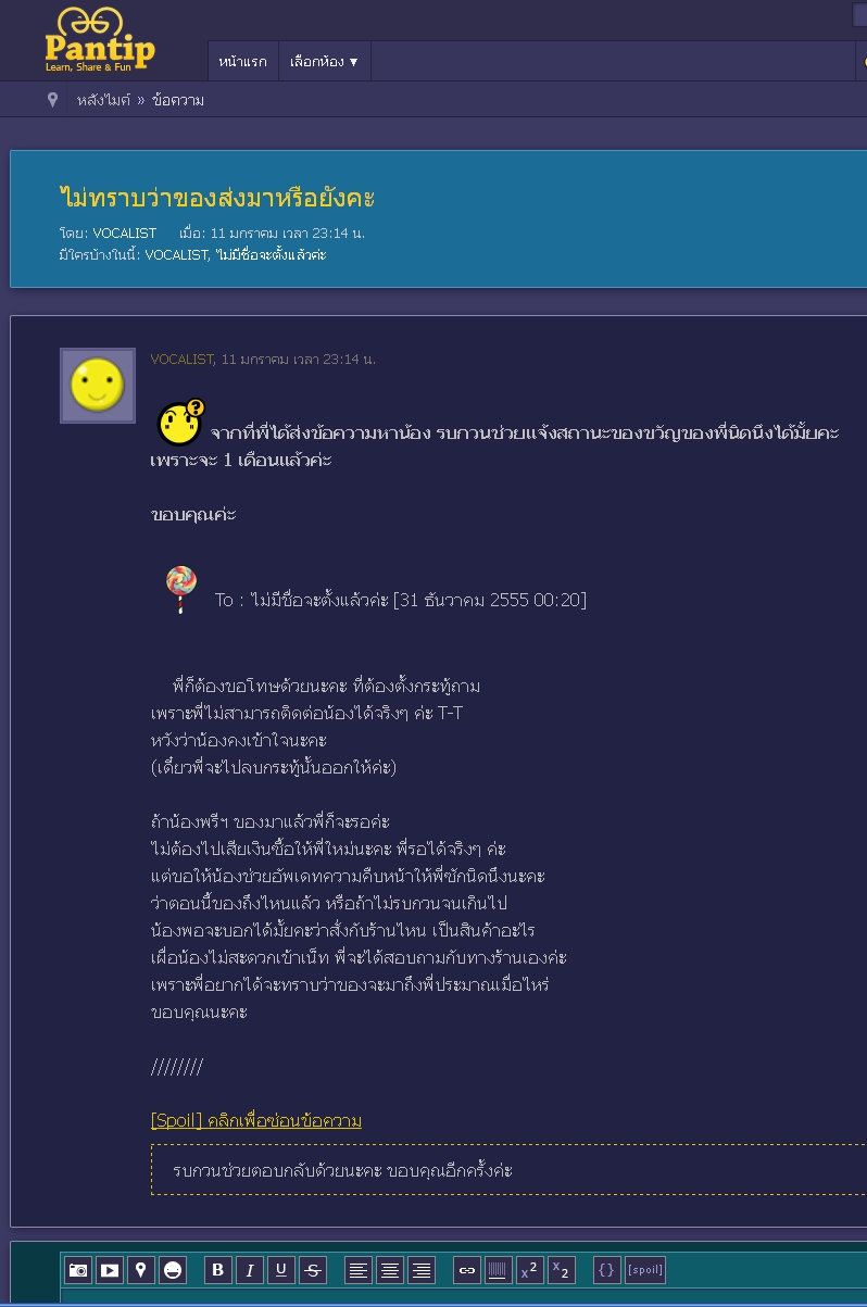 ล่าสุดเมื่อพันทิปเปลี่ยนโฉมใหม่ เราก็ลองส่งข้อความไปหาน้องอีกครั้ง