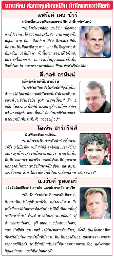 ในที่สุดกุนซือที่เนื้อหอมที่สุดในโลกอย่าง เป๊ป กวาร์ดิโอล่า ก็ตัดสินใจเลือกที่จะไปหาความท้าทายใหม่ในบุนเดสลีกา เยอรมัน กับทีมบาเยิร์น มิวนิค ยักษ์ใหญ่เมืองเบียร์ และหนึ่งในสโมสรที่ประสบความสำเร็จมากที่สุดในวงการลูกหนัง โดยกวาร์ดิโอล่าที่ตกเป็นข่าวกับเชลซี และแมนฯ ซิตี้ มาตลอด เซ็นสัญญาคุม ''เสือใต้'' เป็นเวลาสามปีไปจนถึงปี 2016 โดยจะเข้าไปรับงานต่อจาก จุ๊ปป์ ไฮย์เกส ที่จะวางมือหลังจบฤดูกาลนี้
