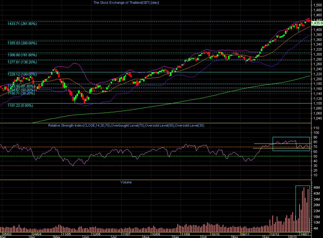 จากครั้งก่อนที่คาดว่าตลาดจะปรับตัวประมาณ 1355.03 จุดแต่ไม่จบมียืดตัวมา 1433.71 จุด ทิศทางของหุ้นตัวเล็กหลายๆตัวเริ่มมีปรับฐานบ้างแล้วตามที่คาดการณ์ไว้ในครั้งก่อน โดยน้ำหนักในการโดนกดจะมีมากขึ้นตามวอลุ่มที่มากขึ้นแต่ราคาไม่วิ่งแรงตาม บวกกับ RSI ทำ Low ใหม่ด้วย ทิศทางมีโอกาสปิดเป็น 3 แท่งแดงบนยอดเขา Maku Pattern ความเสี่ยงจะสูงขึ้นถ้าหลุด 1433.71 จุดและจะจบคลื่น 3-3-5 จะเริ่มเข้าคลื่น 3-4 ที่หลายคนรอคอย โดยการปรับคลื่น 3-4 จะเป็นการปรับคลื่นย่อย ผู้ที่ลงทุนระยะยาวยังสบายใจได้ ส่วนตัวคิดว่าคลื่น 3 นี้ไม่น่าจะยืดทีเดียวไป 1500 จุดควรมีปรับฐานบ้าง การเด้งกลับขึ้นไปจะได้ผ่านง่ายกว่าการวิ่งทีเดียวจบคลื่น 3 เลย เป็นความเห็นส่วนตัวนะครับ พิจารณากันอีกที ขอพลังจงอยู่กับเพื่อนๆทุกคนครับ ^^