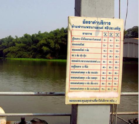 บนเรือข้ามฝาก ข้ามแม่น้ำเจ้าพระยา.ราคาตั๋วเรือข้ามฝาก:ของจักรยานอยู่บนสุด กลางวัน ผู้ใช้จักรยานจ่าย 2 บาท คิดคร่าวๆ ประมาณ 7 เซนต์ (เงินดอลลาร์) ตอนข้ามแม่น้ำโขงที่ลาวจ่าย 2.50 ดอลลาร์. ธุรกิจที่นี่ทำกำไรได้เล็กน้อย,อาจจะเกี่ยวกับสัมปทานและการแบ่งเงินบางส่วนให้ท้องถิ่น.
