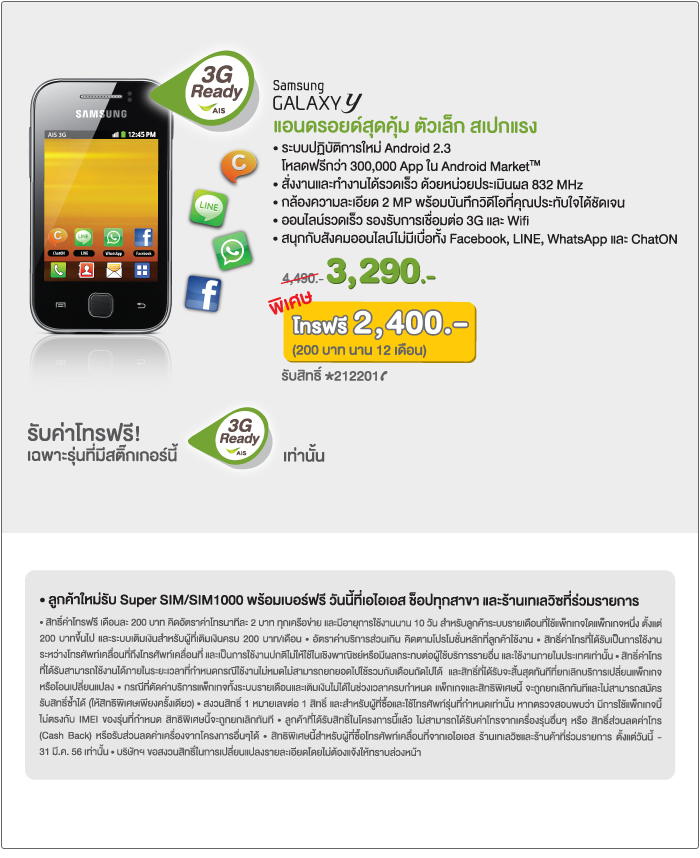 อยากทราบรายละเอียดของโทรศัพท์ sumsung galaxy Y ของ AIS ที่บอกว่าซื้อรุ่นนี้เพียง 3290 จากราคา 4490 แล้วรับค่าโทรฟรี 2400 ที่โฆษณานะครับ ทีนี้พออ่านรายละเอียดตามรูป สรุปว่าต้องเปิดเบอร์ใหม่ แล้วเบอร์เดิมละครับถ้าจะใช้เบอร์เดิมไม่ทราบว่าจะได้หรือป่าวครับ แล้วค่าโทรฟรีที่ได้รับจะได้รับหรือป่าวในกรณีที่ใช้เบอร์เดิม รบกวนผู้รู้ช่วยตอบทีนะครับ