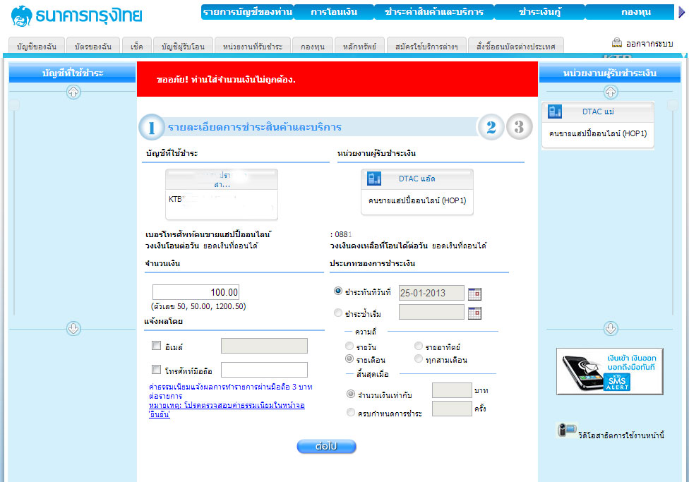 มันบอกว่า "ขออภัย ท่านใส่จำนวนเงินไม่ถูกต้อง" ลองใส่ใหม่ครั้งแล้วครั้งเล่ามันก็ไม่ได้ (ตามภาพเลยนะครับ)