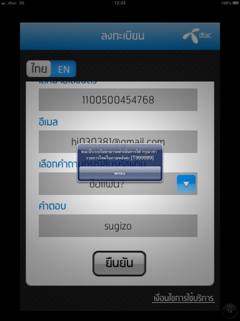 วันนี้ผมไปรับซิมมาและเปิดใช้บริการเรียบร้อยแล้ว..ระบบของผมเป็นรายเดือนครับ และผมจะต้องใช้บริการ e-service แต่ระบบแจ้งว่าผมยังๆม่ได้ลงทะเบียนและผมก็จะลงทะเบียนแต่ระบบแจ้งตามภาพน่ะครับ ตกลงจะใช้ได้เมื่อไหร่ครับ