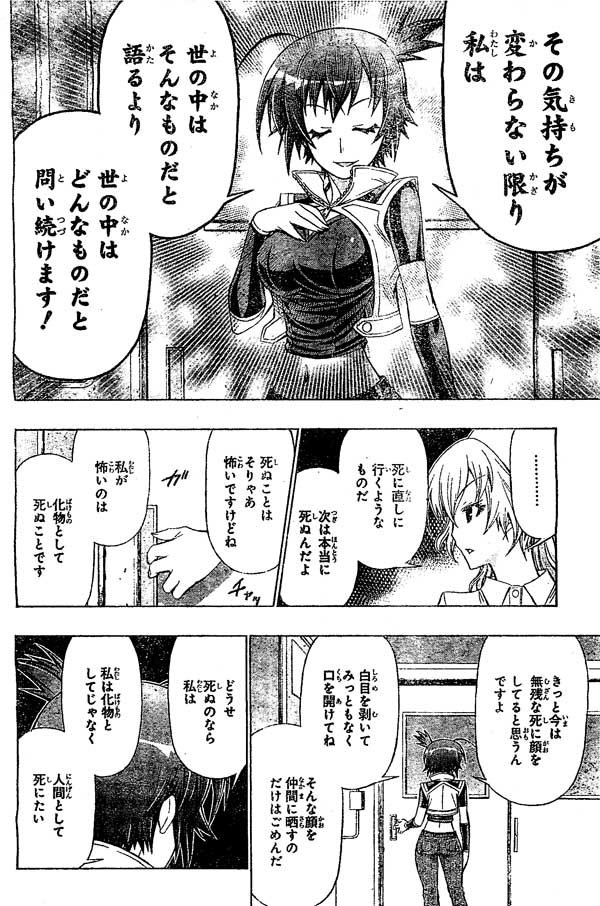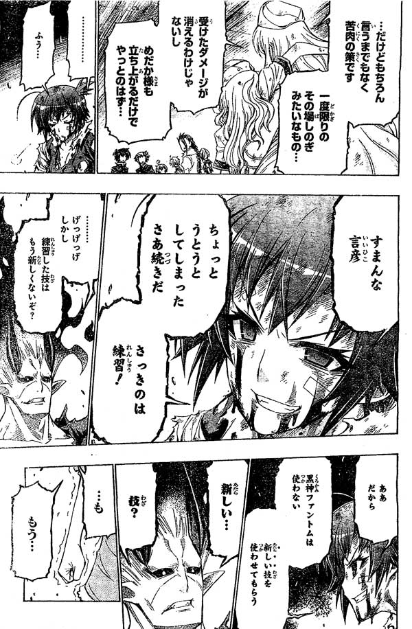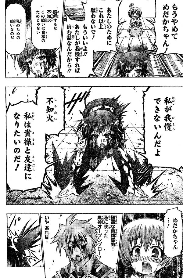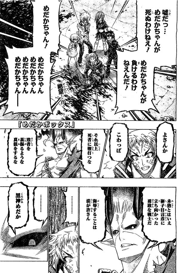 แต่คาเคกาเอะบอกเลยว่านี้เป็นที่พึ่งสุดท้ายอย่างแน่นอนแล้ว วิชาแบบนั้นมันก็แค่ใช้ได้ชั่วคราว จะเป็นอันตรายจริงๆถ้าฟื้นกลับมาได้โดยไม่รักษาตัว มั่นใจเลยว่าตอนนี้แค่ยืนก็คงเต็มที่สุดๆแล้วสำหรับเมดากะ แล้วเมดากะก็พูดขอโทษอิอิฮิโกะบอกดูเหมือนเธอจะเผลอหลับไป ก็บอกมาต่อกัน บอกเมื่อครู่ก็แค่ซ้อมๆ อิอิฮิโกะพูดเลยถึงงั้นชกซ้อมแบบนั้นก็ไม่ได้ผลแล้วนิ เมดากะยอมรับเลยบอกเพราะงั้นเธอจะไม่ใช่คุโรคามิแฟนท่อมแล้ว แต่จะใช้การโจมตี "สดชื่น" อิอิฮิโกะก็งงกับความหมาย