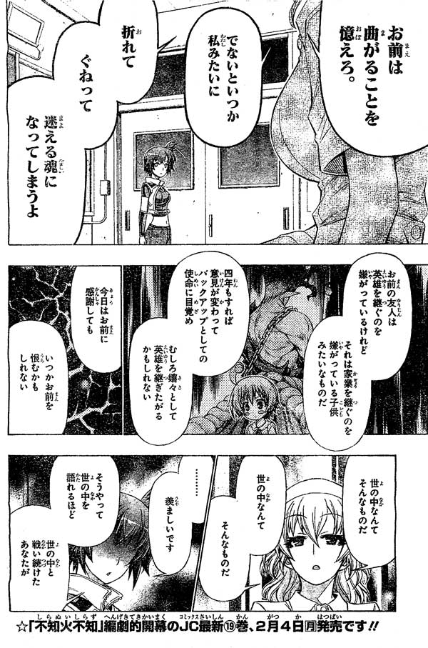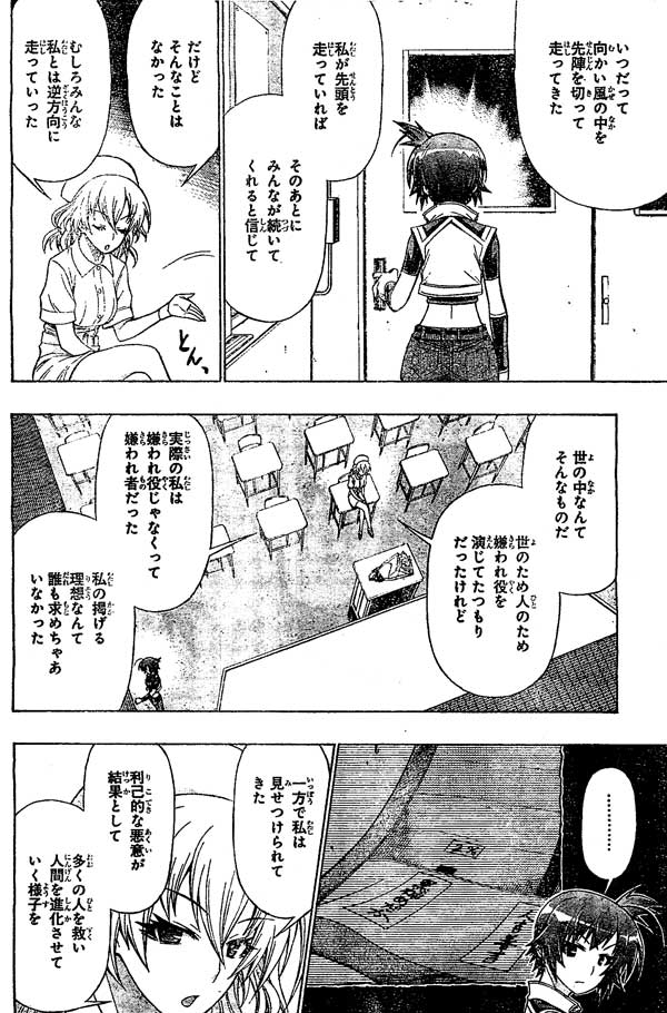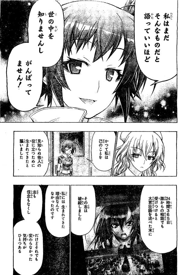ฮาโตะจึงบอกเมดากะให้เรียนรู้หนทางของเมดากะให้ยืดหยุ่นบ้าง ถ้าไม่ได้ในสักวันหนึ่งเมดากะคงจะถูกขยี้ พัง และศูนย์เสียจิตวิญญาณไปเหมือนกันเธอ ฮาโตะรู้ว่าเพื่อนของเมดากะ ชิรานุอิ คือผู้ที่กำลังจะได้เป็นผู้สืบทอดอิอิฮิโกะ แต่แบบนั้นก็เหมือนเด็กที่กำลังปฎิเสธจะสืบทอดกิจการต่อของครอบครัว 4 ปีหลังจากนี้ชิรานุอิอาจเปลี่ยนความคิดและค้นพบความจริงที่มีความหมายของการสืบทอดก็ได้ ชิรานุอิอาจจะดีใจและอยากจะเป็นผู้สืบทอด สักวันอาจจะขอบคุณในวันนี้และอาจจะเกลียดเมดากะในอนาคตก็ได้ ฮาโตะบอกเลยว่านั้นแหละคือโลกที่มุ่งไป นั้นแหละความเป็นจริง เมดากะฟังเงียบๆมาตลอดก็พูดบ้างว่าเธอนั้นอิจฉาที่ฮาโตะได้สู้อย่างเพียงพอแล้วในโลกนี้ถึงได้พูดแบบนั้นได้