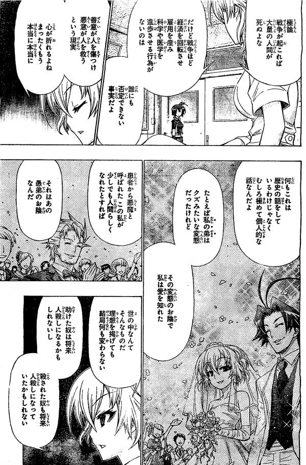 เป็นความคิดสุดขั้วและพูดยกตัวอย่างให้ฟังอย่างสงครามที่จะมีคนตายไม่น้อย เช่นเดียวกับสงครามชีวิตเศรษฐกิจ การจ้างงานและความสำคัญของการช่วยเหลือทางวิทยาศาสตร์และการแพทย์ กลายเป็นว่าความจริงดูเหมือนการทำให้มนุษย์เจ็บปวดเป็นกรรมดีและการช่วยมนุษย์เป็นกรรมชั่ว ชวนให้หักล้างกับที่เชื่อเลยใช่มั้ย ฮาโตะบอกเธอไม่ได้พูดเรื่องประวัติศาสตร์แต่เป็นเรื่องประสบการณ์ของตัวเอง ยกตัวอย่างที่ไม่ว่าจะขยะแขยงหรือวิปริตขนาดไหนของน้องชายของเธอ(ฟุคุโร่) แต่ถึงวิปริตแบบนั้นเธอเองก็ยังรักน้อง แม้ตั้งแต่เล็กตัวเธอจะถูกมองเหมือนนางมารแม้จะครอบครัวตัวเอง แต่ก็ยังมาเป็นมนุษย์ได้กับฟุคุโร่ ความจริงที่ไม่สำคัญว่าจะคงความอุดมคติสักกี่ครั้งมันก็ไม่มีอะไรเกิดขึ้น ไม่มีอะไรเปลี่ยน คนที่เมดากะช่วยนั้นอาจจะเป็นฆาตกรในอนาคตก็ได้ คนที่เมดากะฆ่าอาจเป็นฆาตกรในอนาคตก็ได้เหมือนกัน