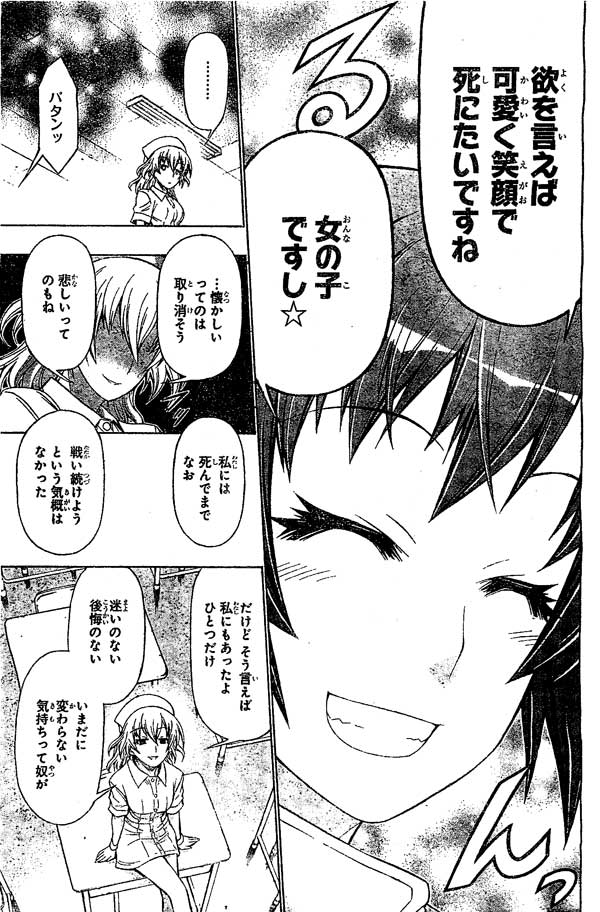 แล้วเมดากะก็ไป ฮาโตะพูดเลยว่าขอถอนคำพูดถึงเรื่องความทรงจำของเธอหรือแบบนั้นควรจะเสียใจดี ตัวเธอนั้นไม่ได้มีไฟแรงที่จะกลับมาต่อสู้เมื่อหลังจากตายไปแล้วเลย แต่ก็คิดว่าแค่ครั้งนี้ครั้งเดียว ไม่มีความสงสัย ไม่มีการเสียใจ ความรู้สึกที่กำลังรู้สึกนี้จะไม่มีวันเปลี่ยนแปลง