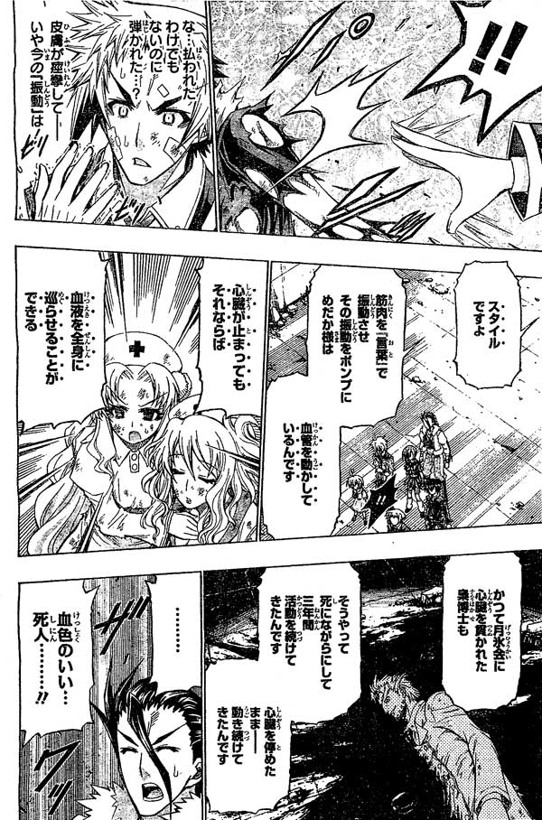 แต่พอยื่นมือเข้าไปหาเซ็นคิจิก็รู้สึกเหมือนโดนผลักออกมามากกว่าจะเหมือนถูกออกห่าง ผิวหนังของเมดากะเหมือนกำลังสั่น ตอนนั้นคาเคกาเอะที่แบกโจโทมาด้วยนั้นก็บอกว่ามันเป็นวิชา ใช้"เสียง(คำพูด)"สั่นกระตุ้นกล้ามเนื้อ เมดากะกำลังใช้การสั่นเพื่อปั๊มการไหลเวียนเลือดของตัวเอง คาเคกาเอะบอกเลยว่าการทำแบบนั้นถึงหัวใจจะหยุดไปแล้วก็เป็นไปได้ที่เลือดจะยังไหลเวียนทั่วทั้งร่างกายได้ เหมือนเมื่อตอนเกะเฮียวไคเคยแทงหัวใจของฟุคุโร่ไปแล้วแต่ฟุคุโร่ก็ยังเคลื่อนไหวได้ทั้งๆที่น่าจะตายไปสามปีแล้ว ฟุคุโร่ยังมีชีวิตอยู่ได้แม้หัวใจจะหยุดเต้นไปแล้ว ไคไรถึงกับตกใจที่พึ่งรู้ว่าฟุคุโร่ยังอยู่รอดได้แม้จะเคยตายไปแล้ว
