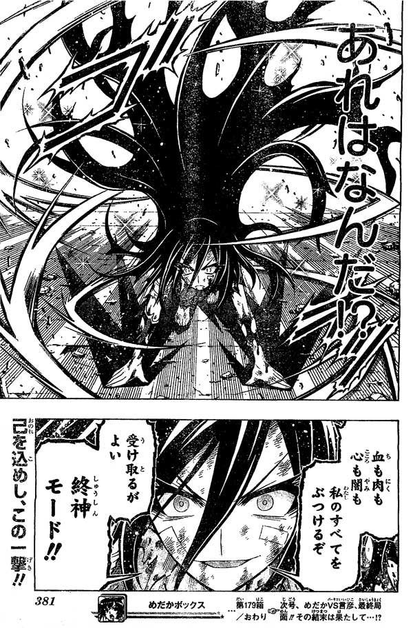 แล้วทันทีนั้นเมดากะก็ใช้โหมดใหม่ทำเอาผมที่สั้นกลับมายาวอีกครั้ง เมดากะบอกเลย เลือดของเธอ ร่างกายเธอ หัวใจเธอ ความมืดของเธอ เธอขอมอบให้ทั้งหมด บอกเลยว่ารับเอาไว้ให้ดีนี่คือ "โหมดเทพสิ้นสุด"