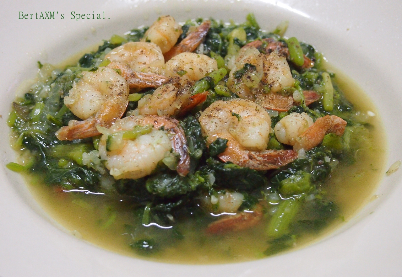 ใส่น้ำมันมะกอก EXTRA VIRGIN ในกระทะ แล้วแท กระเทียม หอม ผัดให้เข้ากัน แล้วใส่กุ้ง ผัดให้ทั่ว ใส่เนยเค็มนิดเดียว เกลือเล็กน้อย ใส่พริกไทดำป่น แล้วค่อยๆ เทผักโขม ผัดให้เข้ากัน แค่นี้ก็ฟาดได้เรยยยยยยยย