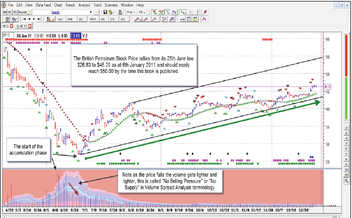 จากกราฟบีพี ในวันที่ 9 มิ.ย.2010 มีวอลุ่มมากผิดปกติ เป็นจุดสังเกตว่ากลุ่มสมาร์ทมันนีมีสายข่าว รู้ว่าการอุดบ่อน้ำมันกำลังใกล้สำเร็จ การสะสมหุ้นของกลุ่มสมาร์ทมันนีดำเนินต่อไปอย่างเงียบๆ จนกระทั่งมีการประกาศข่าวผลสำเร็จของการอุดบ่อน้ำมันได้อย่างถาวร ราคาหุ้นบีพีก็สูงขึ้นเรื่อยๆ และนักล่าก็เพลิดเพลินกับการลิ้มรสเหยื่อ
