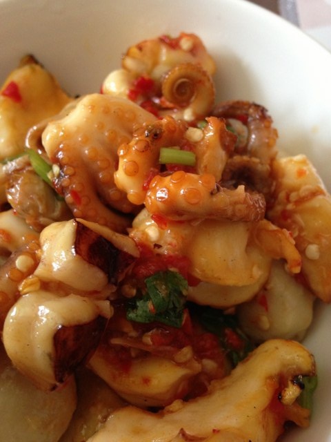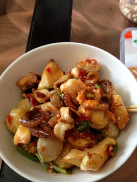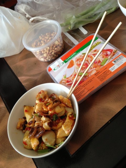 เทใส่ถ้วยแล้วก็ถ่ายรูปคู่กับส้มตำซะหน่อย ขอโทษด้วยที่ไม่ได้ถ่ายรถขายปลาหมึกมาด้วย เพราะไม่ได้คิดที่จะรีวิวร้านขายปลาหมึก เอิ้ก