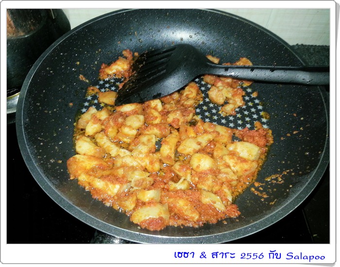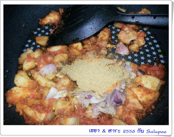 มะเขือเทศเปื่อยเละ น้ำงวดได้ที่ ปรุงเครื่องเทศเพิ่ม คราวนี้ผมใช้ผงฮังเลที่เขาขายเป็น ซอง ทั่วไป
