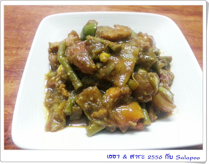 ผัดน้ำพริก หมู หอมได้ที่ เติมน้ำขลุกขลิก ให้หมูเข้าเนื้อและเปื่อยล่วงหน้าไปก่อนสักพัก